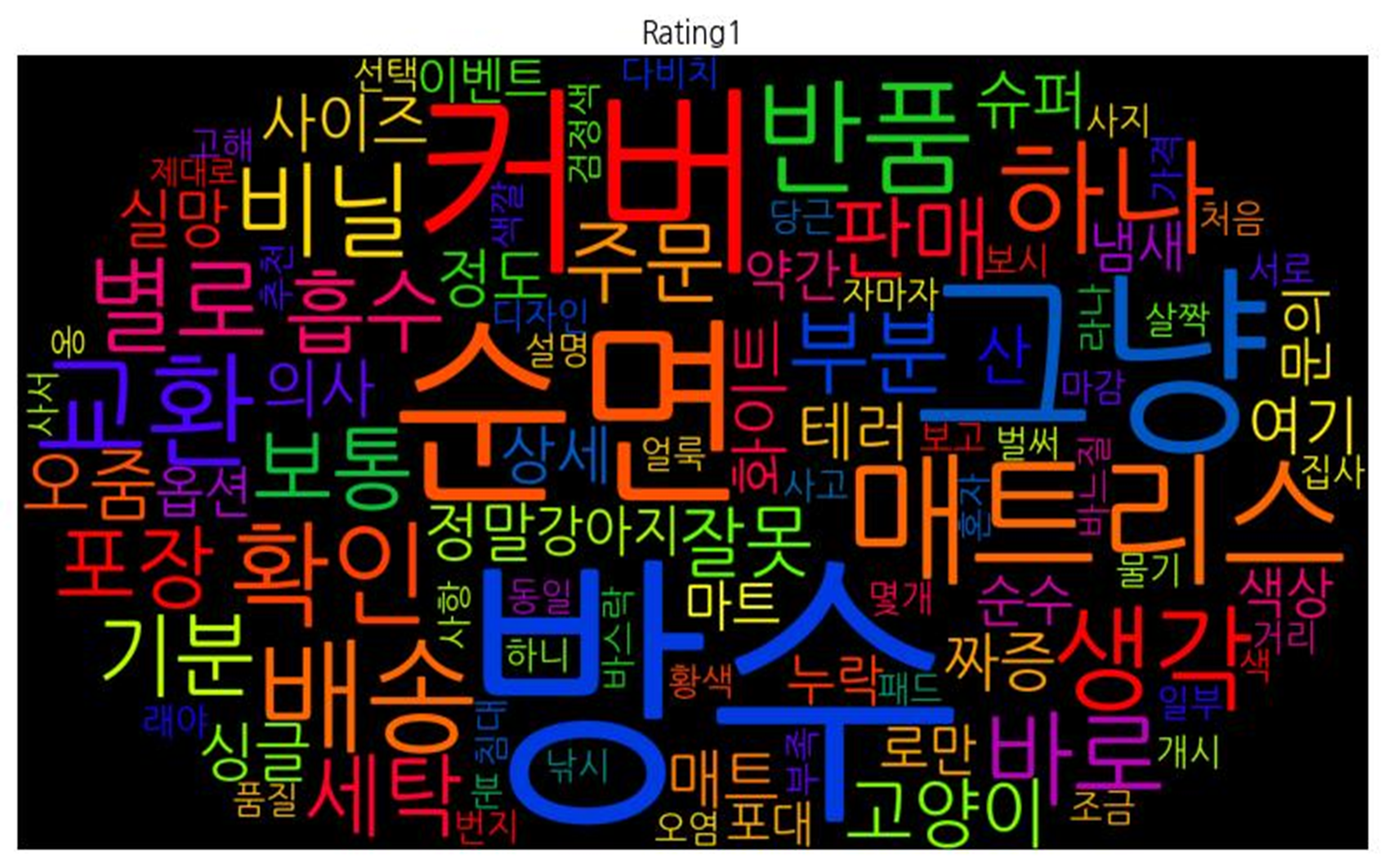 | 평점 1점 | ![]() [('방수', 20), ('커버', 8), ('그냥', 8), ('순면', 8), ('매트리스', 8), ('하나', 6), ('교환', 6), ('배송', 6), ('반품', 6), ('확인', 5), ('생각', 5), ('바로', 4), ('별로', 4), ('비닐', 4), ('포장', 3), ('부분', 3), ('판매', 3), ('기분', 3), ('흡수', 3), ('세탁', 3), ('주문', 3), ('보통', 3), ('고양이', 3), ('오줌', 3), ('잘못', 3), ('매트', 2), ('화이트', 2), ('여기', 2), ('정말', 2), ('짜증', 2), ('사이즈', 2), ('슈퍼', 2), ('싱글', 2), ('상세', 2), ('의사', 2), ('테러', 2), ('실망', 2), ('산', 2), ('정도', 2), ('강아지', 2), ('순수', 2), ('로만', 2), ('마트', 2), ('약간', 2), ('문의', 2), ('누락', 2), ('색상', 2), ('옵션', 2), ('냄새', 2), ('이벤트', 2), ('포대', 2), ('개시', 1), ('오염', 1), ('라나', 1), ('래야', 1), ('서로', 1), ('얼룩', 1), ('물기', 1), ('살짝', 1), ('번지', 1), ('벌써', 1), ('옹', 1), ('다비치', 1), ('보시', 1), ('고해', 1), ('낚시', 1), ('디자인', 1), ('분', 1), ('색깔', 1), ('몇개', 1), ('보고', 1), ('당근', 1), ('처음', 1), ('사고', 1), ('일부', 1), ('조금', 1), ('사지', 1), ('바스락', 1), ('거리', 1), ('검정색', 1), ('황색', 1), ('하니', 1), ('동일', 1), ('색', 1), ('품질', 1), ('바느질', 1), ('마감', 1), ('선택', 1), ('사항', 1), ('설명', 1), ('부족', 1), ('가격', 1), ('추천', 1), ('집사', 1), ('혼자', 1), ('침대', 1), ('자마자', 1), ('패드', 1), ('사서', 1), ('제대로', 1)] |