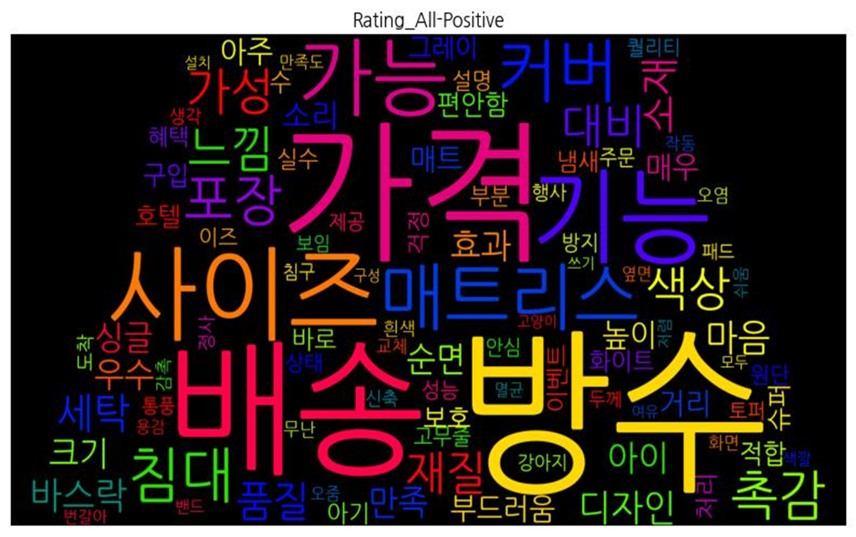 | 긍정 속성 | ![]() [('방수', 1085), ('가격', 765), ('배송', 705), ('사이즈', 694), ('기능', 686), ('가능', 440), ('매트리스', 408), ('커버', 358), ('침대', 272), ('포장', 229), ('촉감', 216), ('가성', 184), ('느낌', 176), ('색상', 170), ('대비', 169), ('재질', 154), ('세탁', 128), ('품질', 126), ('소재', 125), ('디자인', 99), ('마음', 99), ('바스락', 98), ('아이', 89), ('효과', 87), ('우수', 85), ('만족', 85), ('크기', 85), ('순면', 81), ('싱글', 79), ('소리', 74), ('높이', 70), ('매우', 67), ('아주', 67), ('매트', 65), ('거리', 65), ('부드러움', 65), ('보호', 54), ('편안함', 54), ('적합', 52), ('그레이', 52), ('구입', 51), ('슈퍼', 51), ('호텔', 49), ('처리', 48), ('바로', 48), ('수', 47), ('걱정', 45), ('화이트', 45), ('아기', 45), ('이벤트', 45), ('냄새', 43), ('실수', 42), ('혜택', 40), ('설명', 39), ('부분', 39), ('이즈', 38), ('원단', 38), ('상태', 37), ('고무줄', 37), ('방지', 36), ('성능', 36), ('토퍼', 35), ('주문', 34), ('제공', 34), ('안심', 34), ('퀄리티', 34), ('행사', 33), ('도착', 33), ('보임', 32), ('정사', 32), ('두께', 31), ('강아지', 31), ('통풍', 31), ('신축', 30), ('패드', 30), ('생각', 30), ('침구', 30), ('오염', 29), ('감촉', 29), ('흰색', 29), ('무난', 29), ('교체', 28), ('작동', 28), ('화면', 27), ('쉬움', 27), ('만족도', 26), ('오줌', 26), ('옆면', 26), ('색깔', 24), ('저렴', 24), ('번갈아', 24), ('용감', 24), ('밴드', 24), ('멸균', 24), ('쓰기', 22), ('모두', 22), ('여유', 21), ('고양이', 21), ('구성', 21), ('설치', 21)] |
