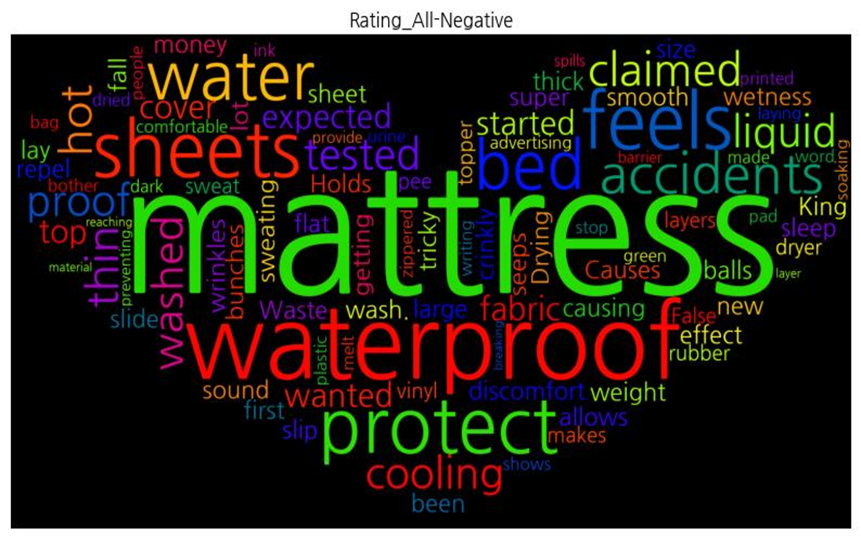 | 부정 속성 | ![]() [('mattress', 9), ('waterproof', 8), ('feels', 4), ('sheets', 4), ('protect', 4), ('water', 3), ('bed', 3), ('accidents', 3), ('thin', 2), ('claimed', 2), ('hot', 2), ('cooling', 2), ('tested', 2), ('proof', 2), ('liquid', 2), ('washed', 2), ('expected', 2), ('wanted', 2), ('cover', 2), ('top', 2), ('started', 2), ('fabric', 2), ('Waste', 1), ('money', 1), ('new', 1), ('weight', 1), ('super', 1), ('fall', 1), ('first', 1), ('wash.', 1), ('sleep', 1), ('slip', 1), ('slide', 1), ('Causes', 1), ('sweating', 1), ('discomfort', 1), ('effect', 1), ('been', 1), ('repel', 1), ('allows', 1), ('wetness', 1), ('seeps', 1), ('Holds', 1), ('lot', 1), ('King', 1), ('size', 1), ('large', 1), ('causing', 1), ('wrinkles', 1), ('crinkly', 1), ('sound', 1), ('getting', 1), ('lay', 1), ('flat', 1), ('smooth', 1), ('bunches', 1), ('sheet', 1), ('thick', 1), ('Drying', 1), ('tricky', 1), ('balls', 1), ('rubber', 1), ('dryer', 1), ('layers', 1), ('vinyl', 1), ('pee', 1), ('topper', 1), ('makes', 1), ('sweat', 1), ('False', 1), ('advertising', 1), ('zippered', 1), ('word', 1), ('printed', 1), ('dark', 1), ('green', 1), ('ink', 1), ('pad', 1), ('shows', 1), ('melt', 1), ('dried', 1), ('laying', 1), ('plastic', 1), ('bag', 1), ('comfortable', 1), ('stop', 1), ('urine', 1), ('soaking', 1), ('writing', 1), ('bother', 1), ('people', 1), ('made', 1), ('provide', 1), ('barrier', 1), ('preventing', 1), ('spills', 1), ('reaching', 1), ('layer', 1), ('material', 1), ('breaking', 1)] |