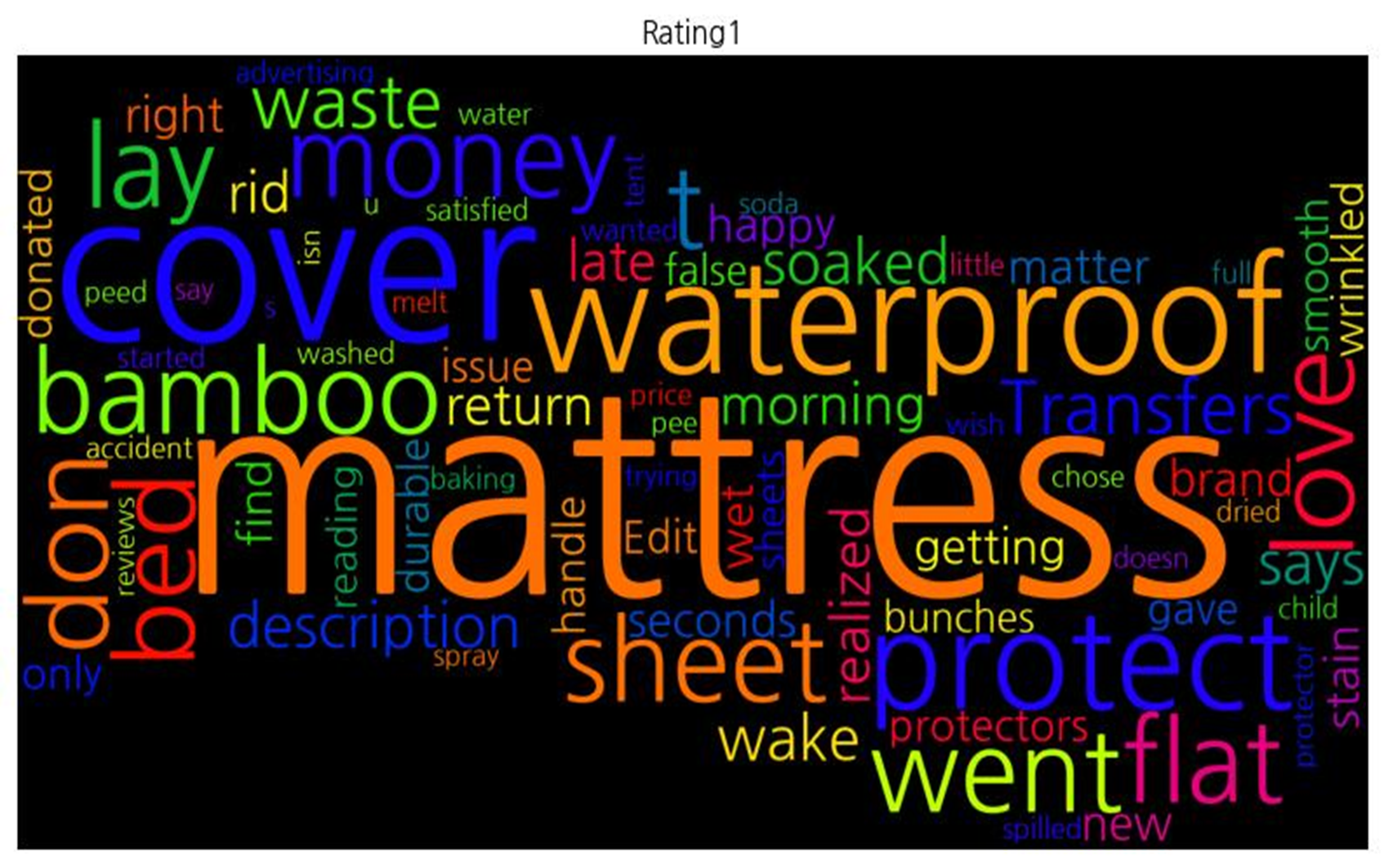 | 평점 1점 | ![]() [('mattress', 9), ('cover', 4), ('waterproof', 4), ('protect', 3), ('don', 2), ('money', 2), ('went', 2), ('bamboo', 2), ('sheet', 2), ('lay', 2), ('flat', 2), ('love', 2), ('bed', 2), ('t', 2), ('Transfers', 1), ('waste', 1), ('description', 1), ('says', 1), ('wake', 1), ('soaked', 1), ('morning', 1), ('realized', 1), ('late', 1), ('return', 1), ('rid', 1), ('getting', 1), ('wet', 1), ('right', 1), ('matter', 1), ('seconds', 1), ('find', 1), ('happy', 1), ('brand', 1), ('new', 1), ('stain', 1), ('protectors', 1), ('Edit', 1), ('gave', 1), ('donated', 1), ('handle', 1), ('wrinkled', 1), ('durable', 1), ('only', 1), ('issue', 1), ('smooth', 1), ('bunches', 1), ('reading', 1), ('sheets', 1), ('false', 1), ('advertising', 1), ('say', 1), ('s', 1), ('isn', 1), ('u', 1), ('washed', 1), ('dried', 1), ('started', 1), ('melt', 1), ('little', 1), ('satisfied', 1), ('accident', 1), ('protector', 1), ('full', 1), ('pee', 1), ('trying', 1), ('spray', 1), ('baking', 1), ('soda', 1), ('wish', 1), ('chose', 1), ('price', 1), ('reviews', 1), ('spilled', 1), ('water', 1), ('child', 1), ('peed', 1), ('doesn', 1), ('wanted', 1), ('tent', 1)] |