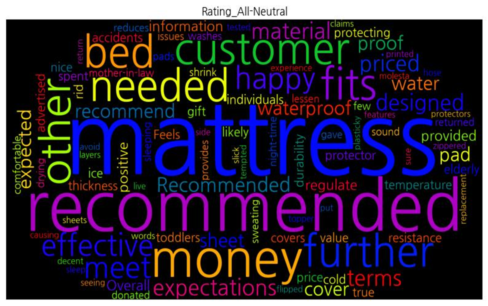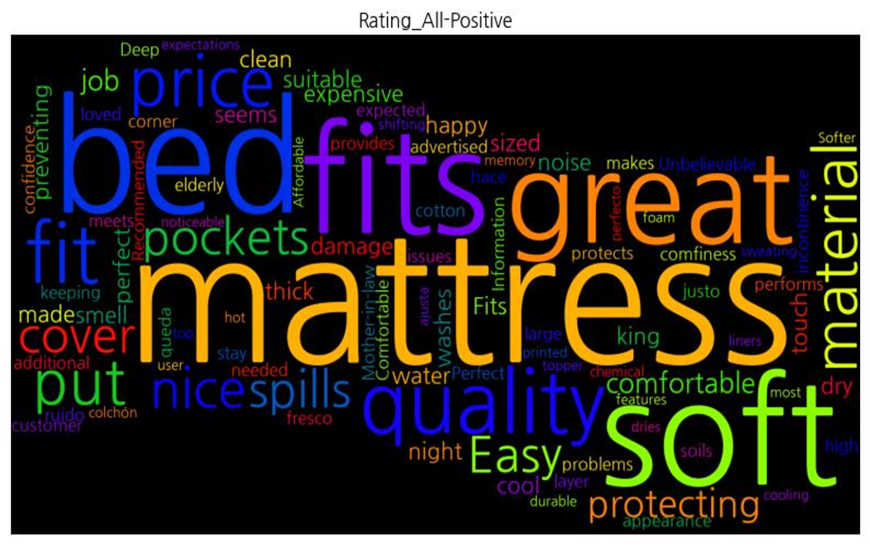 | 평점 전체 | ![]() [('mattress', 45), ('cover', 22), ('bed', 21), ('great', 15), ('soft', 12), ('fit', 12), ('water', 11), ('waterproof', 10), ('quality', 10), ('fits', 9), ('price', 8), ('t', 8), ('nice', 7), ('put', 7), ('s', 7), ('sheet', 7), ('happy', 6), ('protector', 6), ('money', 5), ('easy', 5), ('hot', 5), ('sheets', 5), ('cooling', 5), ('material', 5), ('protect', 5), ('pad', 5), ('keep', 4), ('top', 4), ('feels', 4), ('night', 4), ('thick', 4), ('love', 4), ('proof', 4), ('recommend', 4), ('feel', 4), ('washed', 4), ('pockets', 3), ('don', 3), ('little', 3), ('plastic', 3), ('new', 3), ('seems', 3), ('made', 3), ('dry', 3), ('clean', 3), ('expected', 3), ('bamboo', 3), ('protecting', 3), ('spilled', 3), ('went', 3), ('job', 3), ('lay', 3), ('durable', 3), ('anything', 3), ('wanted', 3), ('warm', 3), ('perfect', 3), ('going', 3), ('peed', 3), ('doesn', 3), ('large', 2), ('waste', 2), ('needed', 2), ('deep', 2), ('layer', 2), ('other', 2), ('king', 2), ('sized', 2), ('touch', 2), ('problem', 2), ('vinyl', 2), ('says', 2), ('felt', 2), ('super', 2), ('thin', 2), ('first', 2), ('wash', 2), ('designed', 2), ('okay', 2), ('guess', 2), ('sleep', 2), ('expensive', 2), ('soaked', 2), ('return', 2), ('advertised', 2), ('true', 2), ('toddler', 2), ('spills', 2), ('cool', 2), ('been', 2), ('tested', 2), ('brands', 2), ('something', 2), ('getting', 2), ('right', 2), ('brand', 2), ('dryer', 2), ('run', 2), ('recommended', 2), ('smell', 2)] |