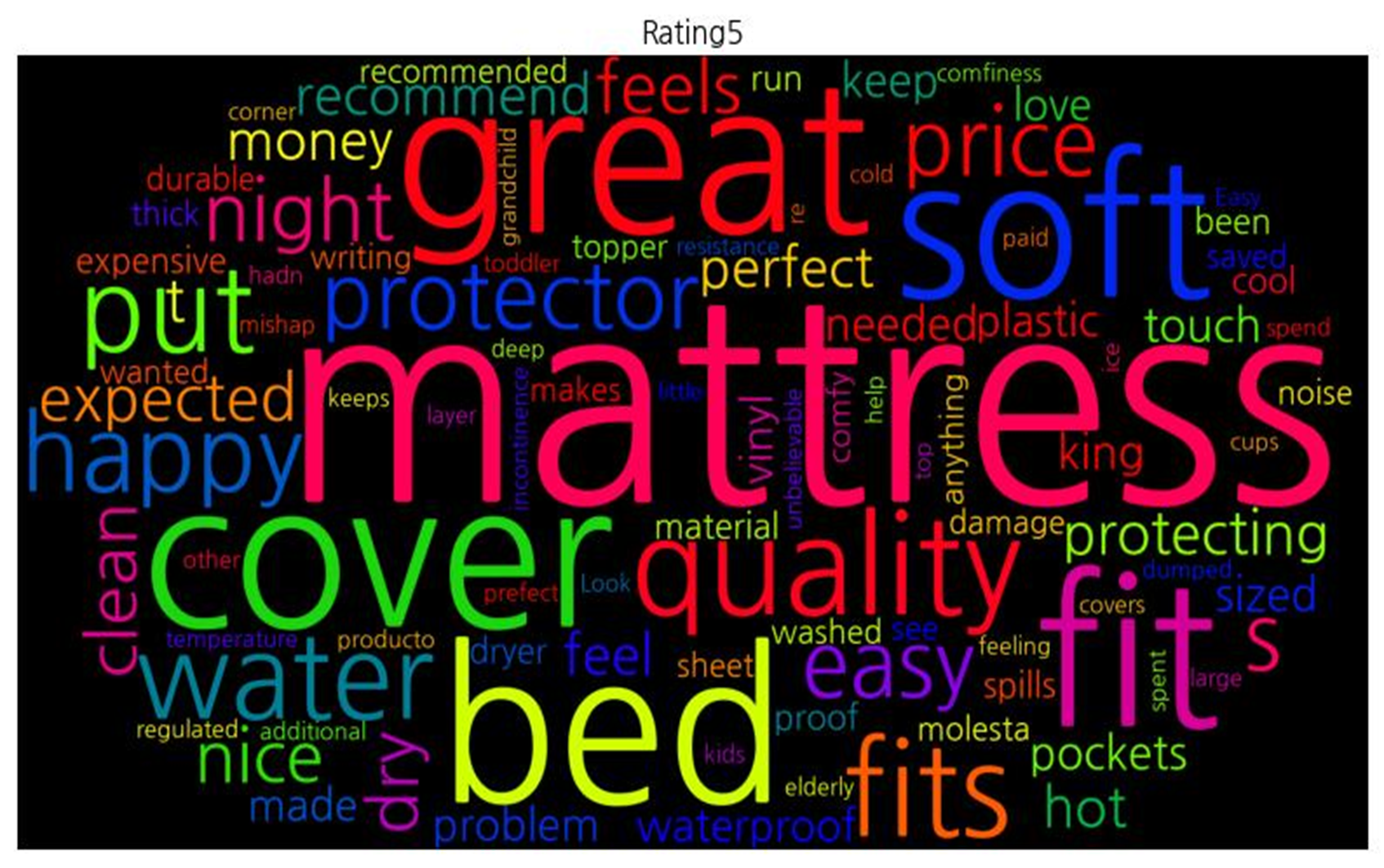 | 평점 5점 | ![]() [('mattress', 26), ('bed', 12), ('great', 12), ('fit', 11), ('cover', 11), ('soft', 10), ('quality', 8), ('fits', 7), ('water', 6), ('put', 6), ('happy', 5), ('protector', 5), ('easy', 5), ('price', 5), ('s', 5), ('night', 4), ('nice', 3), ('feels', 3), ('dry', 3), ('clean', 3), ('expected', 3), ('protecting', 3), ('t', 3), ('recommend', 3), ('hot', 3), ('money', 3), ('feel', 3), ('perfect', 3), ('pockets', 2), ('needed', 2), ('keep', 2), ('king', 2), ('sized', 2), ('touch', 2), ('problem', 2), ('waterproof', 2), ('vinyl', 2), ('plastic', 2), ('love', 2), ('made', 2), ('expensive', 2), ('spills', 2), ('cool', 2), ('material', 2), ('been', 2), ('proof', 2), ('dryer', 2), ('run', 2), ('recommended', 2), ('thick', 2), ('sheet', 2), ('comfy', 2), ('noise', 2), ('molesta', 2), ('topper', 2), ('makes', 2), ('damage', 2), ('see', 2), ('anything', 2), ('saved', 2), ('wanted', 2), ('durable', 2), ('writing', 2), ('washed', 2), ('large', 1), ('corner', 1), ('producto', 1), ('prefect', 1), ('deep', 1), ('ice', 1), ('cold', 1), ('help', 1), ('temperature', 1), ('regulated', 1), ('additional', 1), ('layer', 1), ('comfiness', 1), ('top', 1), ('resistance', 1), ('other', 1), ('spent', 1), ('grandchild', 1), ('spend', 1), ('mishap', 1), ('hadn', 1), ('kids', 1), ('little', 1), ('covers', 1), ('feeling', 1), ('Look', 1), ('paid', 1), ('unbelievable', 1), ('re', 1), ('toddler', 1), ('dumped', 1), ('cups', 1), ('keeps', 1), ('incontinence', 1), ('elderly', 1), ('Easy', 1)] |