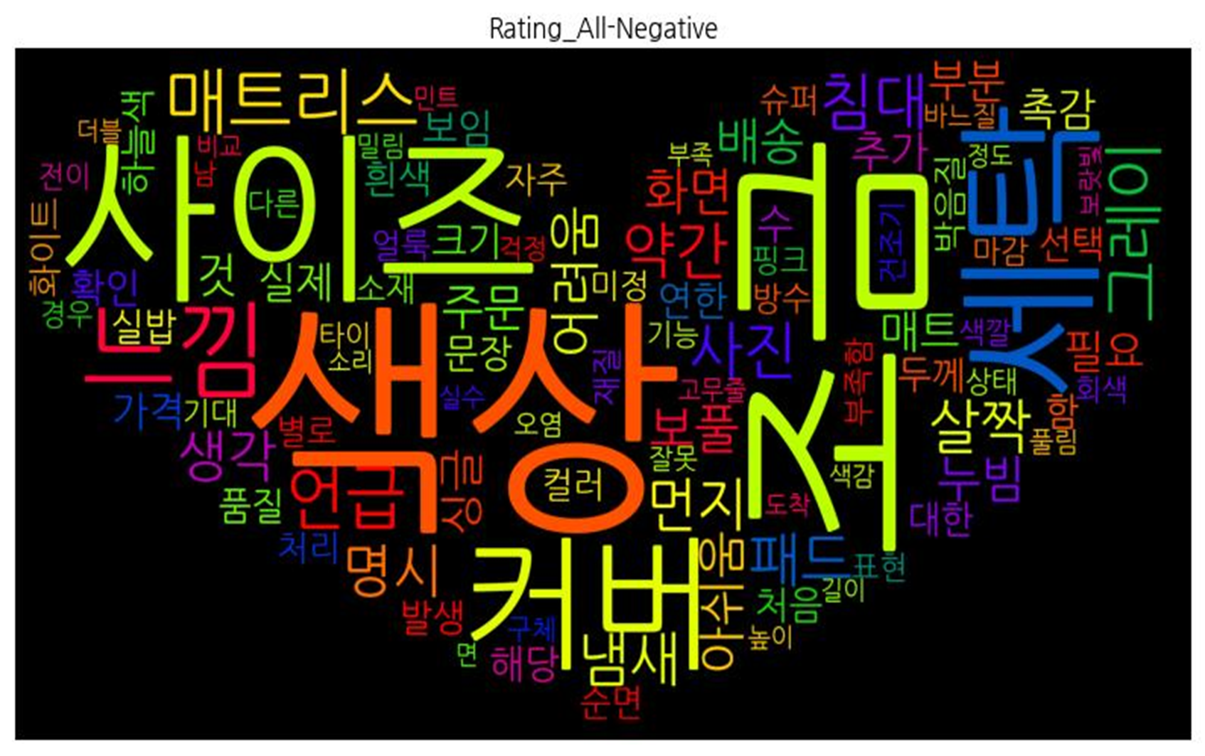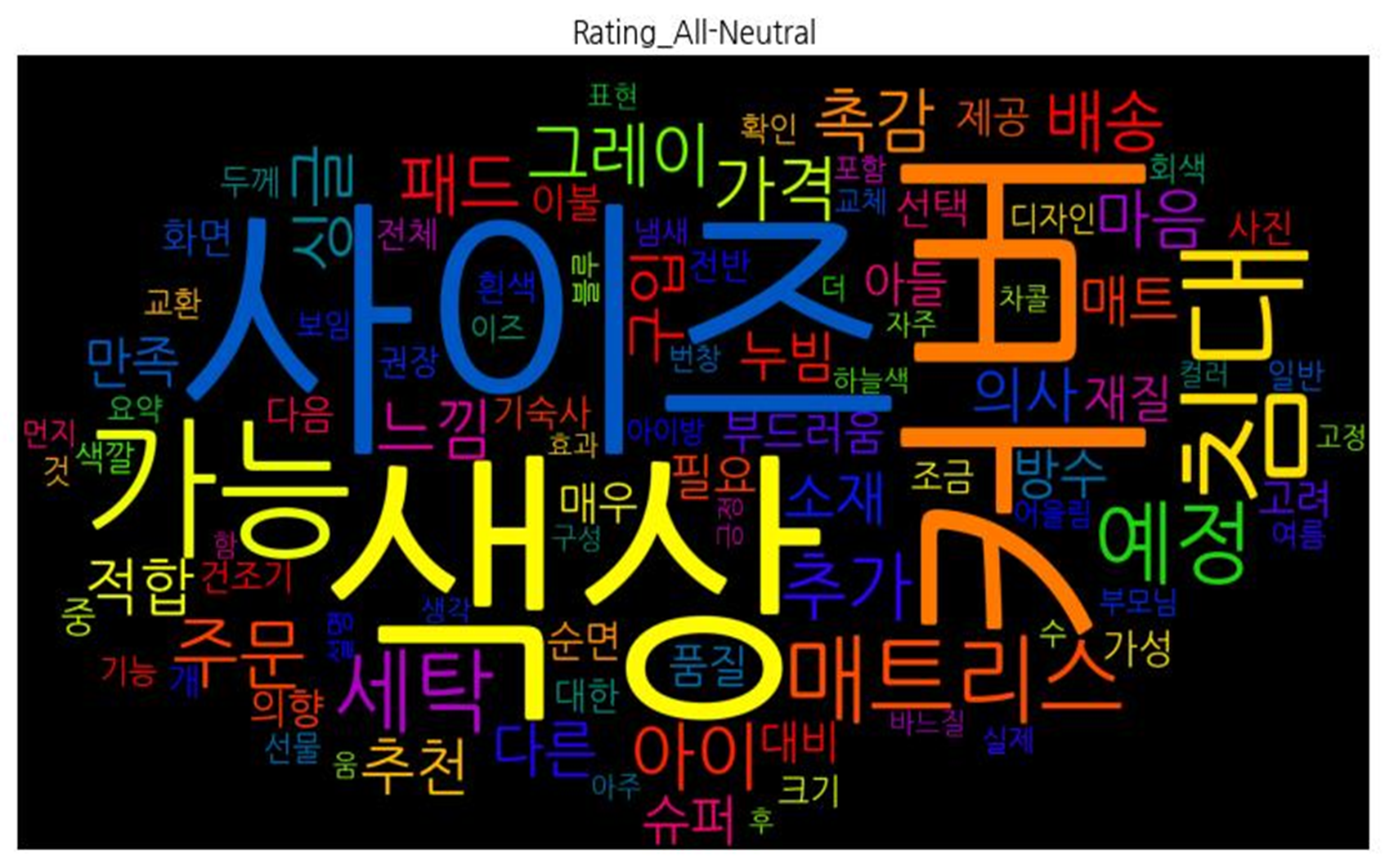 | 부정 속성 | ![]() [('색상', 133), ('조금', 108), ('사이즈', 88), ('세탁', 66), ('커버', 54), ('느낌', 50), ('매트리스', 47), ('언급', 42), ('그레이', 38), ('침대', 34), ('사진', 33), ('약간', 32), ('살짝', 30), ('패드', 30), ('냄새', 30), ('먼지', 29), ('명시', 29), ('생각', 28), ('어려움', 26), ('아쉬움', 23), ('보풀', 23), ('배송', 22), ('누빔', 22), ('화면', 22), ('주문', 20), ('싱글', 19), ('것', 19), ('매트', 18), ('필요', 18), ('부분', 17), ('촉감', 17), ('추가', 17), ('실제', 16), ('가격', 15), ('수', 15), ('확인', 14), ('해당', 14), ('연한', 14), ('크기', 14), ('보임', 14), ('문장', 13), ('처음', 13), ('두께', 13), ('흰색', 13), ('하늘색', 13), ('함', 13), ('대한', 12), ('실밥', 12), ('품질', 12), ('발생', 12), ('선택', 12), ('자주', 11), ('컬러', 11), ('순면', 11), ('박음질', 11), ('처리', 11), ('화이트', 11), ('슈퍼', 10), ('방수', 10), ('별로', 10), ('소재', 10), ('얼룩', 10), ('미정', 10), ('핑크', 9), ('부족함', 9), ('재질', 9), ('기대', 9), ('표현', 9), ('마감', 9), ('건조기', 8), ('전이', 8), ('기능', 8), ('색깔', 8), ('타이', 8), ('상태', 8), ('회색', 8), ('경우', 8), ('다른', 8), ('구체', 7), ('잘못', 7), ('풀림', 7), ('바느질', 7), ('오염', 7), ('걱정', 7), ('밀림', 7), ('남', 7), ('고무줄', 6), ('도착', 6), ('색감', 6), ('소리', 6), ('길이', 6), ('실수', 6), ('높이', 6), ('부족', 6), ('비교', 6), ('보랏빛', 6), ('정도', 6), ('민트', 6), ('더블', 6), ('면', 6)] |