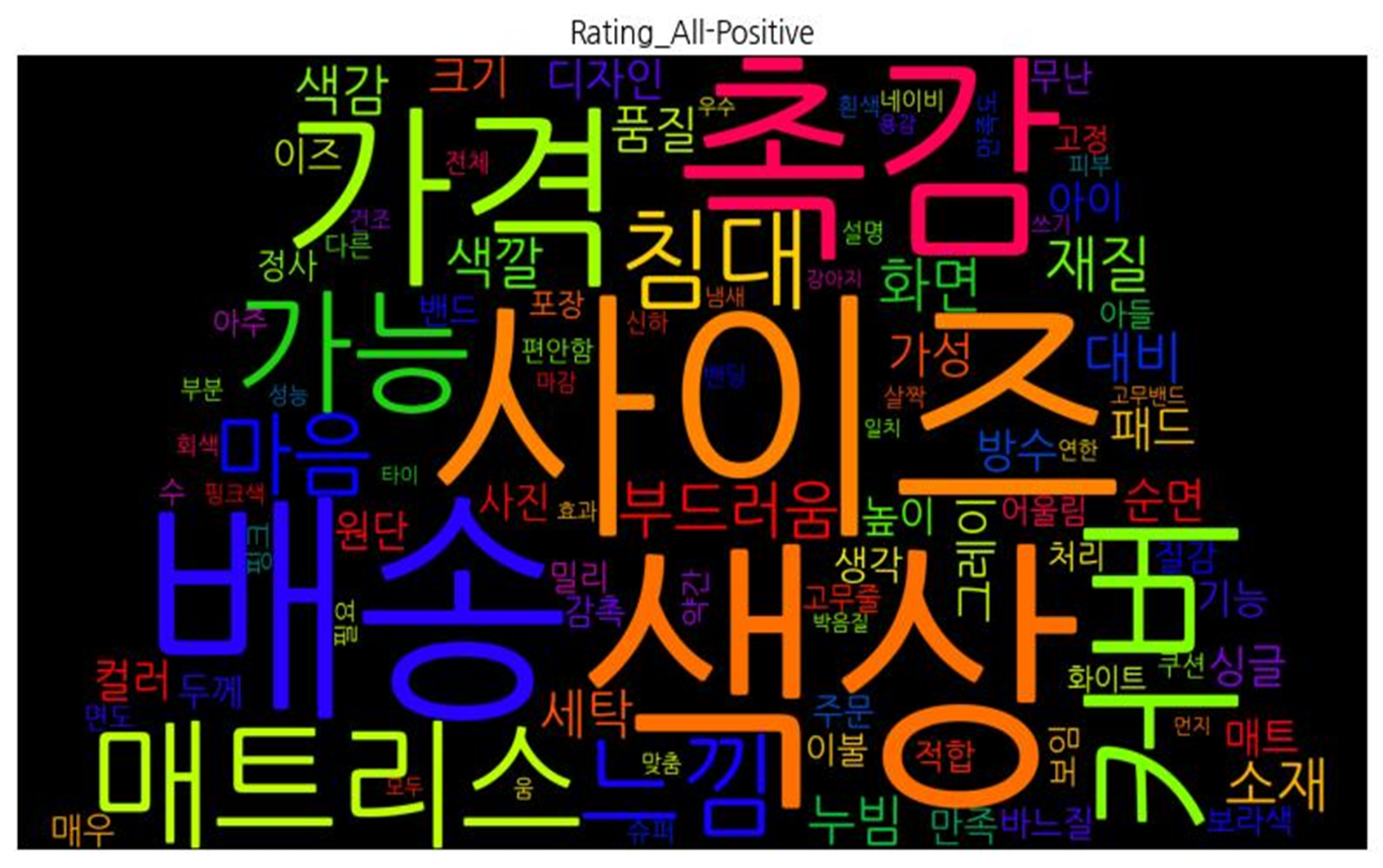 | 평점 전체 | ![]() [('배송', 1096), ('용기', 852), ('사이즈', 821), ('색상', 807), ('커버', 623), ('침대', 536), ('가격', 460), ('촉감', 440), ('생각', 410), ('달', 407), ('매트리스', 386), ('세탁', 289), ('아주', 288), ('주문', 249), ('대비', 230), ('느낌', 220), ('마음', 218), ('아이', 212), ('조금', 210), ('그레이', 206), ('화면', 201), ('싱글', 193), ('패드', 184), ('가성', 180), ('구입', 172), ('색깔', 165), ('재질', 163), ('누빔', 159), ('사진', 142), ('매트', 135), ('그냥', 132), ('방수', 130), ('품질', 123), ('순면', 123), ('색감', 122), ('아들', 121), ('색도', 119), ('만족', 113), ('무난', 113), ('듭니', 112), ('슈퍼', 109), ('약간', 106), ('하나', 94), ('크기', 84), ('살짝', 82), ('원단', 82), ('소재', 81), ('이불', 81), ('두께', 78), ('추천', 77), ('이즈', 77), ('핑크', 75), ('먼지', 72), ('정말', 71), ('냄새', 69), ('정도', 67), ('바느질', 67), ('컬러', 67), ('보풀', 67), ('다음', 66), ('완전', 65), ('다른', 64), ('맘', 61), ('더', 58), ('포장', 56), ('바로', 55), ('쓰기', 55), ('정사', 55), ('건조기', 54), ('의사', 54), ('것', 54), ('기숙사', 53), ('화이트', 50), ('부분', 49), ('감촉', 49), ('흰색', 49), ('처음', 48), ('높이', 48), ('번창', 47), ('보고', 47), ('선택', 46), ('처리', 46), ('아이방', 46), ('고무줄', 44), ('그대로', 44), ('회색', 44), ('마감', 44), ('최고', 44), ('고정', 43), ('모두', 43), ('걱정', 42), ('질감', 42), ('보라색', 41), ('추가', 40), ('밴드', 39), ('박음질', 39), ('후기', 39), ('싸이', 39), ('성비', 38), ('부모님', 38)] |
