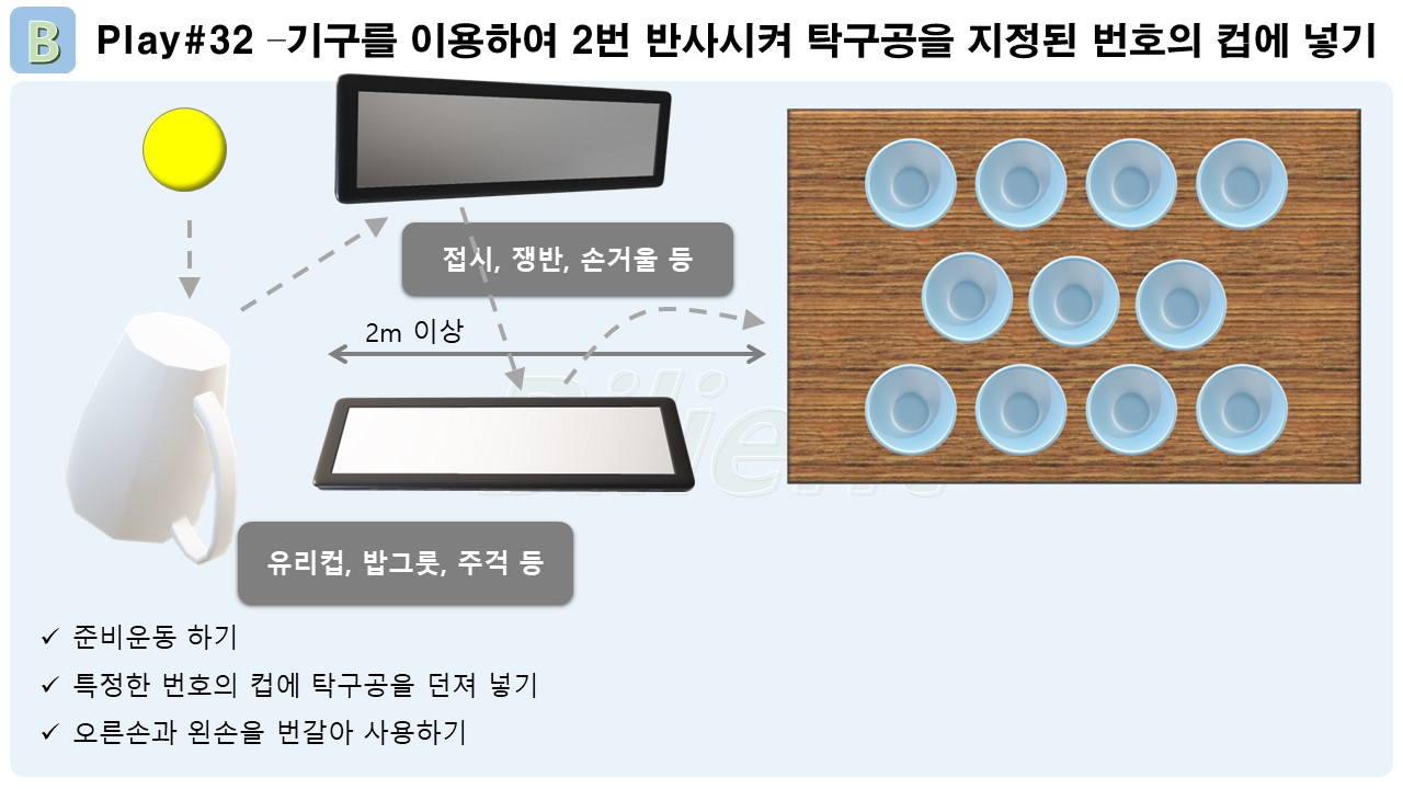 - 탁구공을 살짝 위로 던진 후 도구를 이용하여 공을 튕긴 후 반사된 공을 지정 번호의 종이컵에 집어 넣는다.