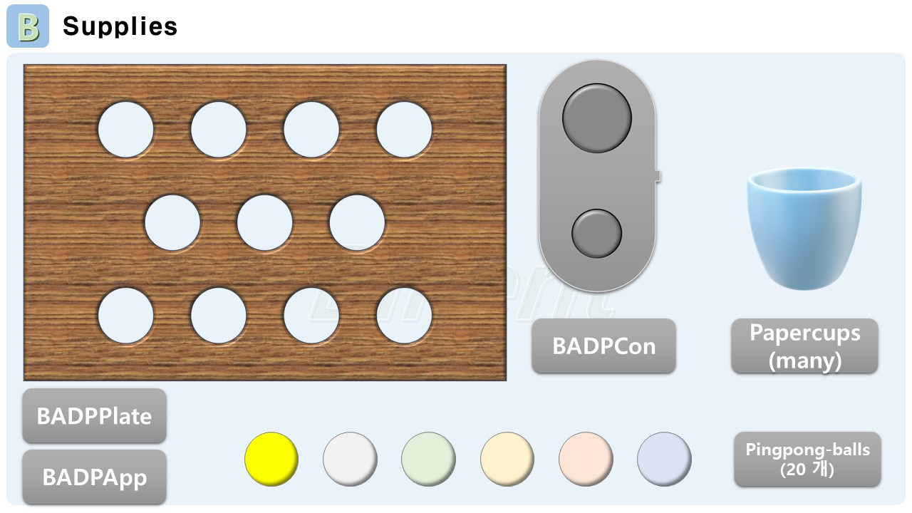 ▶ Supplies : BADP-Plate, BADP-Con, BADP-App, Pingpong-Balls, Papercups and so on