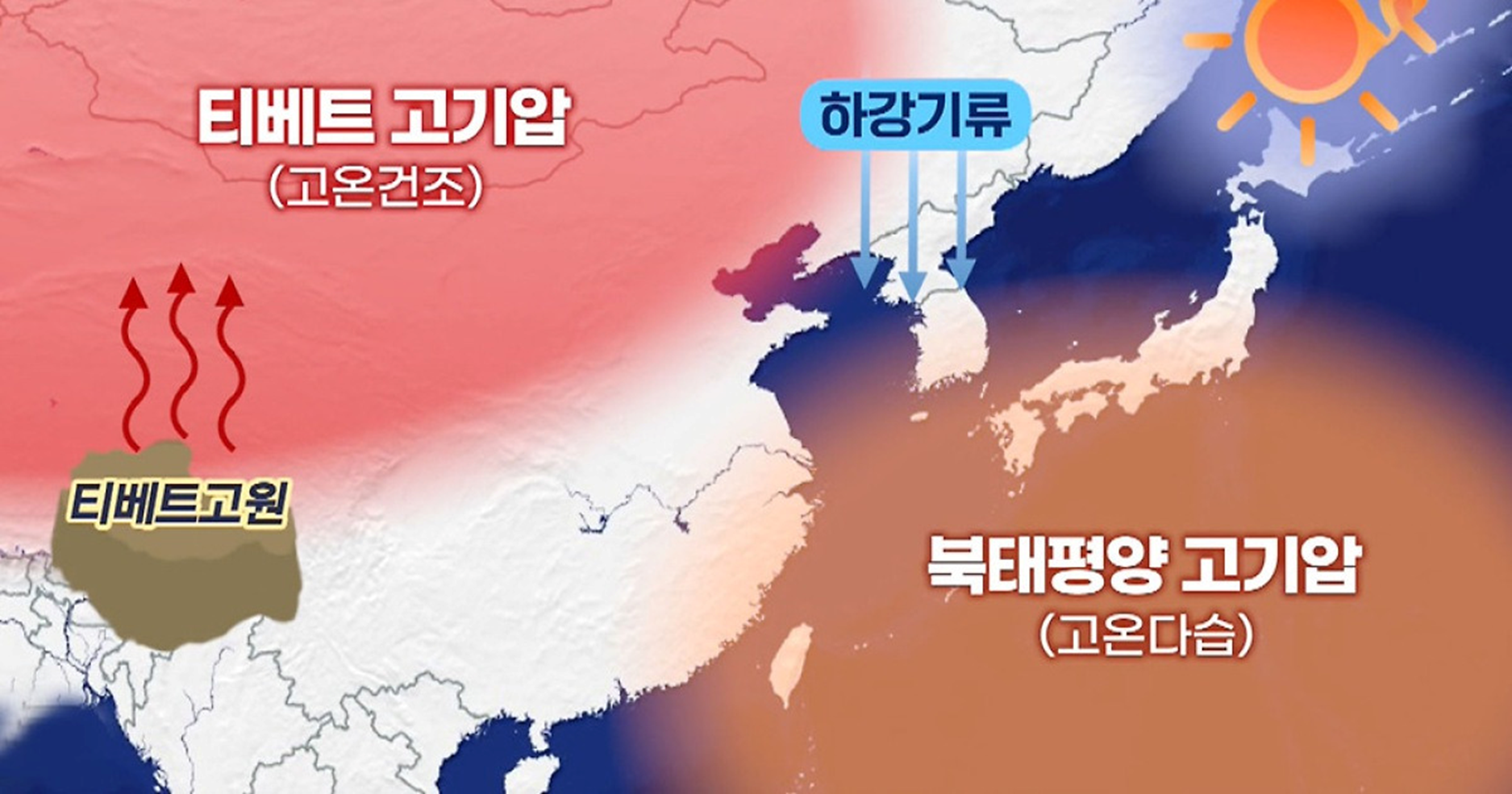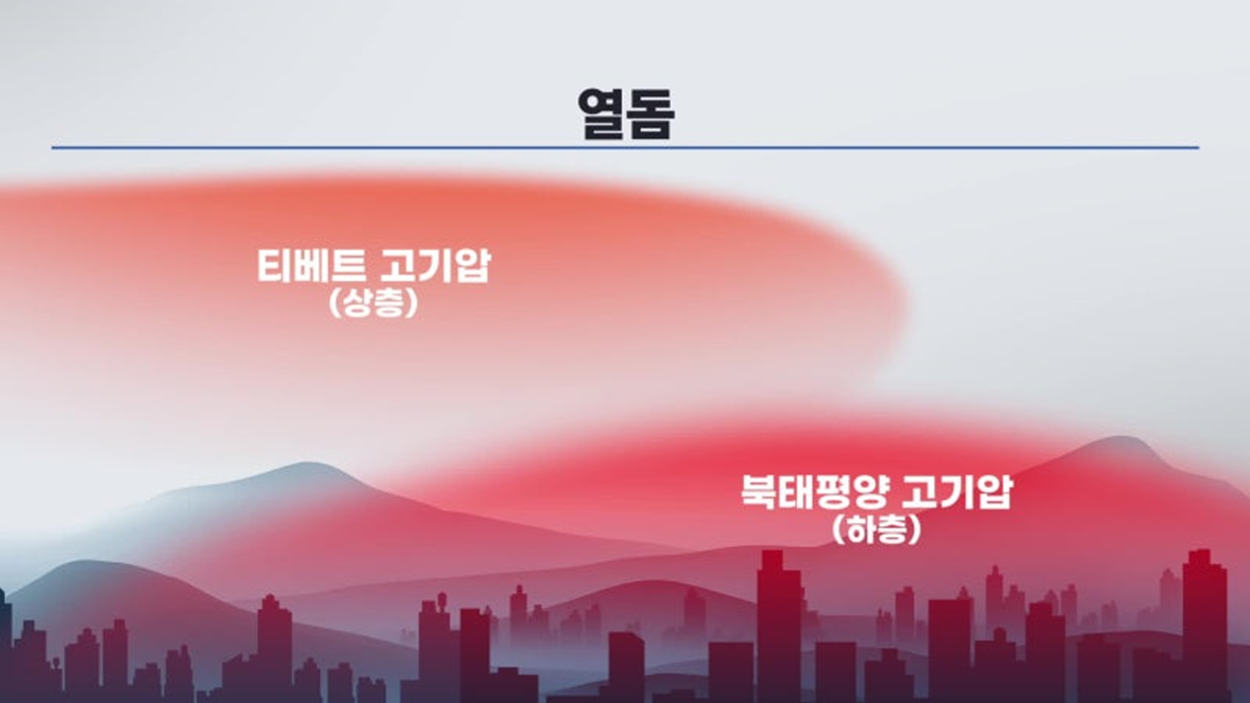 - 티벳 고기압 : 우리나라까지 올 게 아닌데, 따뜻한 북태평양 고기압과 함께 넓게 분포돼 태풍 및 찬기온의 유입 차단