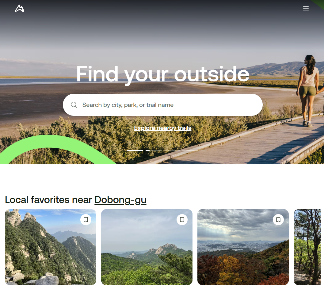 | 하이킹 및 등산 경로를 AI가 추천하는 서비스. 사용자의 체력, 경험, 선호 경치를 입력하면 AI가 맞춤형 코스를 생성하고, 실시간 날씨와 위험 요소를 알려줌. |