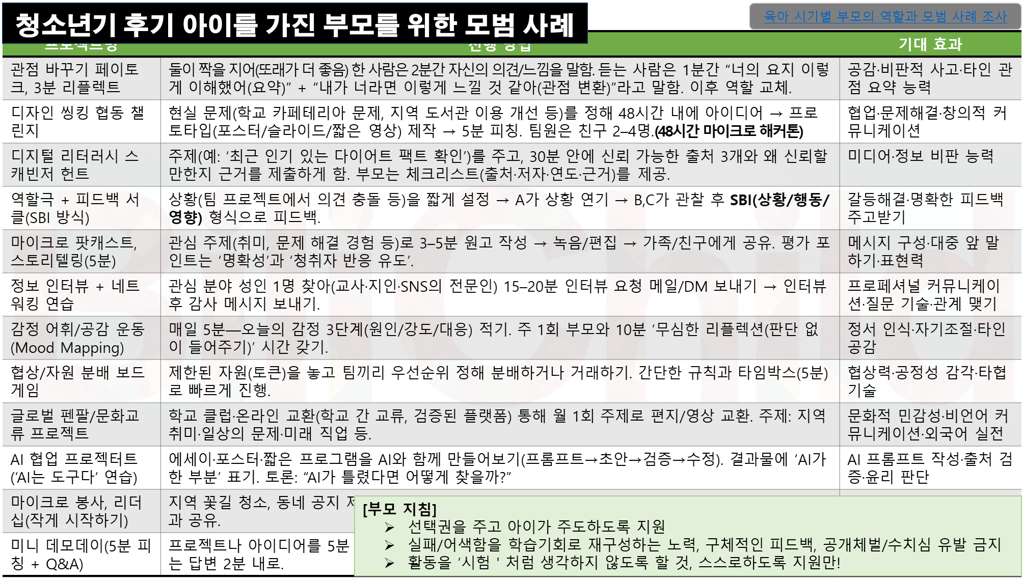 | 미니 데모데이(5분 피칭 + Q&A) | 프로젝트나 아이디어를 5분 내로 정리해 발표 → 청중(가족·친구)에게 3개의 질문만 받기 → 발표자는 답변 2분 내로. | 간결한 의사전달·즉문즉답·자기홍보 능력 |