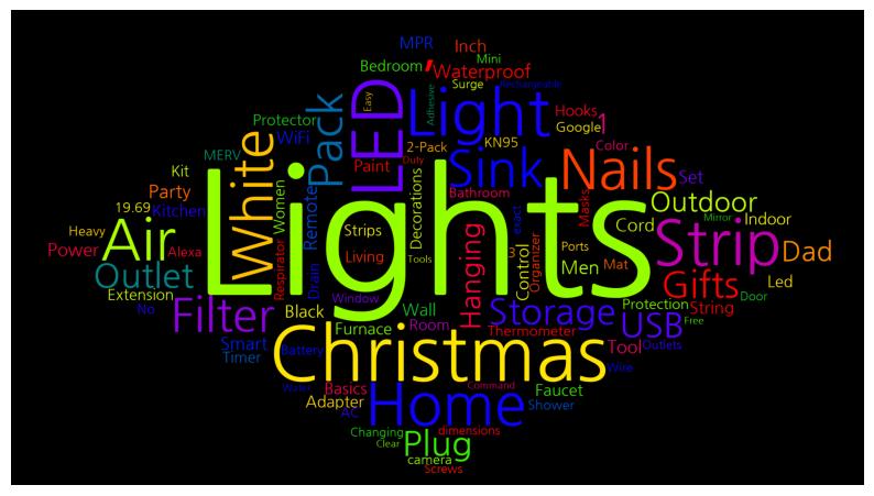 [('Lights', 42), ('Christmas', 28), ('LED', 24), ('Light', 20), ('Strip', 19), ('Home', 17), ('Air', 16), (',', 16), ('White', 15), ('Nails', 15), ('Sink', 14), ('Filter', 13), ('Pack', 13), ('Storage', 13), ('Gifts', 13), ('USB', 12), ('Plug', 12), ('Outlet', 12), ('Outdoor', 12), ('1', 12), ('Dad', 12), ('Hanging', 12), ('Waterproof', 11), ('Party', 11), ('Remote', 11), ('Men', 11), ('Smart', 10), ('Cord', 10), ('Power', 10), ('Set', 10), ('Tool', 10), ('Black', 9), ('Inch', 9), ('WiFi', 9), ('Control', 9), ('Wall', 9), ('String', 9), ('Furnace', 8), ('MPR', 8), ('Kitchen', 8), ('Paint', 8), ('Led', 8), ('Indoor', 8), ('Basics', 8), ('Adapter', 8), ('Faucet', 8), ('Living', 7), ('Kit', 7), ('Timer', 7), ('Bedroom', 7), ('Drain', 7), ('Extension', 7), ('Protector', 7), ('Strips', 7), ('Decorations', 7), ('Hooks', 7), ('Women', 7), ('Room', 7), ('Thermometer', 7), ('Protection', 7), ('19.69', 6), ('MERV', 6), ('2-Pack', 6), ('Organizer', 6), ('AC', 6), ('Alexa', 6), ('Google', 6), ('Color', 6), ('No', 6), ('3', 6), ('Battery', 6), ('Heavy', 6), ('Bathroom', 6), ('Shower', 6), ('Mat', 6), ('KN95', 6), ('Masks', 6), ('Respirator', 6), ('camera', 6), ('exact', 5), ('dimensions', 5), ('Window', 5), ('Door', 5), ('Changing', 5), ('Screws', 5), ('Surge', 5), ('Outlets', 5), ('Ports', 5), ('Mini', 5), ('Wire', 5), ('Rechargeable', 5), ('Free', 5), ('Clear', 5), ('Command', 5), ('Duty', 5), ('Adhesive', 5), ('Tools', 5), ('Water', 5), ('Easy', 5), ('Mirror', 5)]