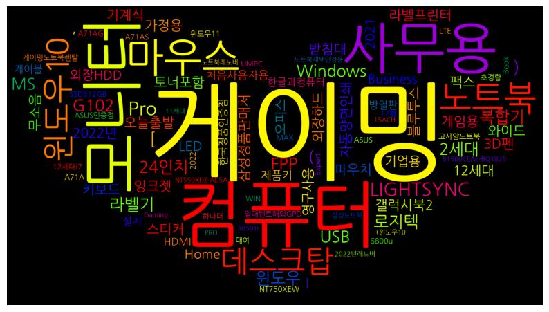 [('게이밍', 12), ('컴퓨터', 12), ('모니터', 9), ('사무용', 8), ('마우스', 7), ('노트북', 5), ('윈도우10', 4), ('데스크탑', 4), ('LIGHTSYNC', 4), ('Pro', 4), ('24인치', 3), ('라벨기', 3), ('복합기', 3), ('(', 3), (')', 3), ('로지텍', 3), ('G102', 3), ('2세대', 3), ('USB', 3), ('윈도우', 3), ('MS', 3), ('FPP', 3), ('Windows', 3), ('[', 3), ('갤럭시북2', 2), ('2022년', 2), ('게임용', 2), ('12세대', 2), ('가정용', 2), ('LED', 2), ('와이드', 2), ('라벨프린터', 2), ('스티커', 2), ('오늘출발', 2), ('삼성정품판매처', 2), ('잉크젯', 2), ('토너포함', 2), ('자동양면인쇄', 2), ('3D펜', 2), ('블루투스', 2), ('팩스', 2), ('무소음', 2), ('키보드', 2), ('기계식', 2), ('받침대', 2), ('파우치', 2), ('외장하드', 2), ('외장HDD', 2), (',', 2), ('오피스', 2), ('2021', 2), ('기업용', 2), ('Home', 2), ('Business', 2), ('영구사용', 2), ('처음사용자용', 2), ('제품키', 2), ('한글과컴퓨터', 2), ('한국정품인증점', 2), (']', 2), ('설치', 2), ('HDMI', 2), ('케이블', 2), ('방열판', 2), ('2022', 1), ('NT750XEW', 1), ('12세대i7', 1), ('윈도우11', 1), ('SSD512GB', 1), ('하나더', 1), ('A71A', 1), ('A71AG', 1), ('A71AS', 1), ('대여', 1), ('게이밍노트북렌탈', 1), ('17형', 1), ('고사양노트북', 1), ('임대렌트해외GPD', 1), ('WIN', 1), ('MAX', 1), ('UMPC', 1), ('LTE', 1), ('6800u', 1), ('초경량', 1), ('ASUS인증점', 1), ('ASUS', 1), ('Expert', 1), ('Book', 1), ('B1500CEAE-BQ1825', 1), ('노트북재택인강용', 1), ('삼성노트북', 1), ('NT550XDZ-AD5A', 1), ('+윈도우10', 1), ('11세대', 1), ('2022년레노버', 1), ('Gaming', 1), ('15ACH', 1), ('3050Ti', 1), ('PRO', 1), ('노트북레노버', 1)]