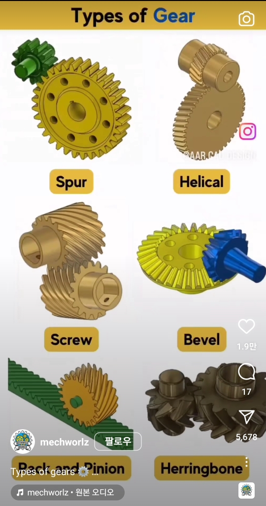 - 웜(Worm) 기어 : 웜&웜휠, 전달 효율이 낮지만 소음이 없음.