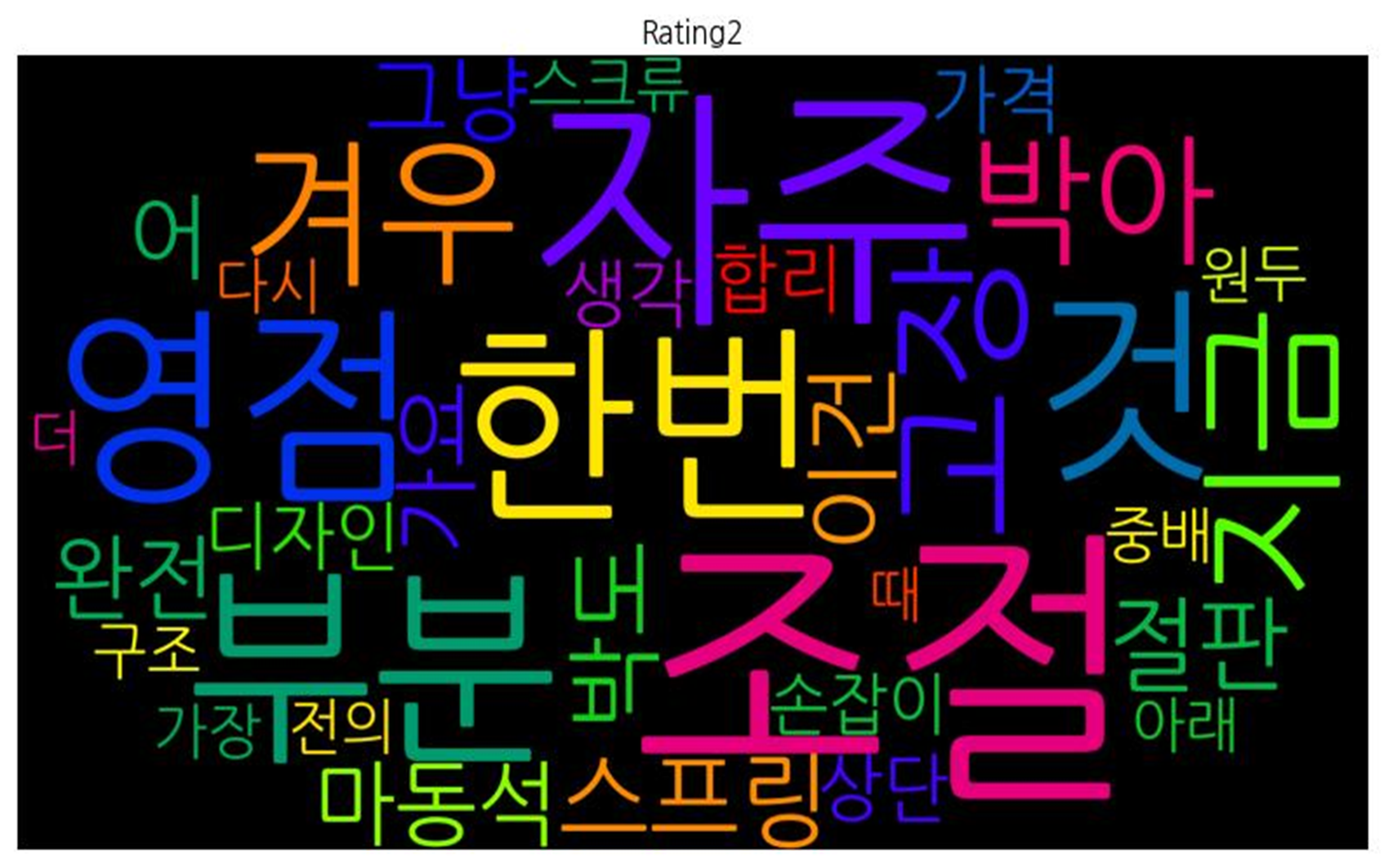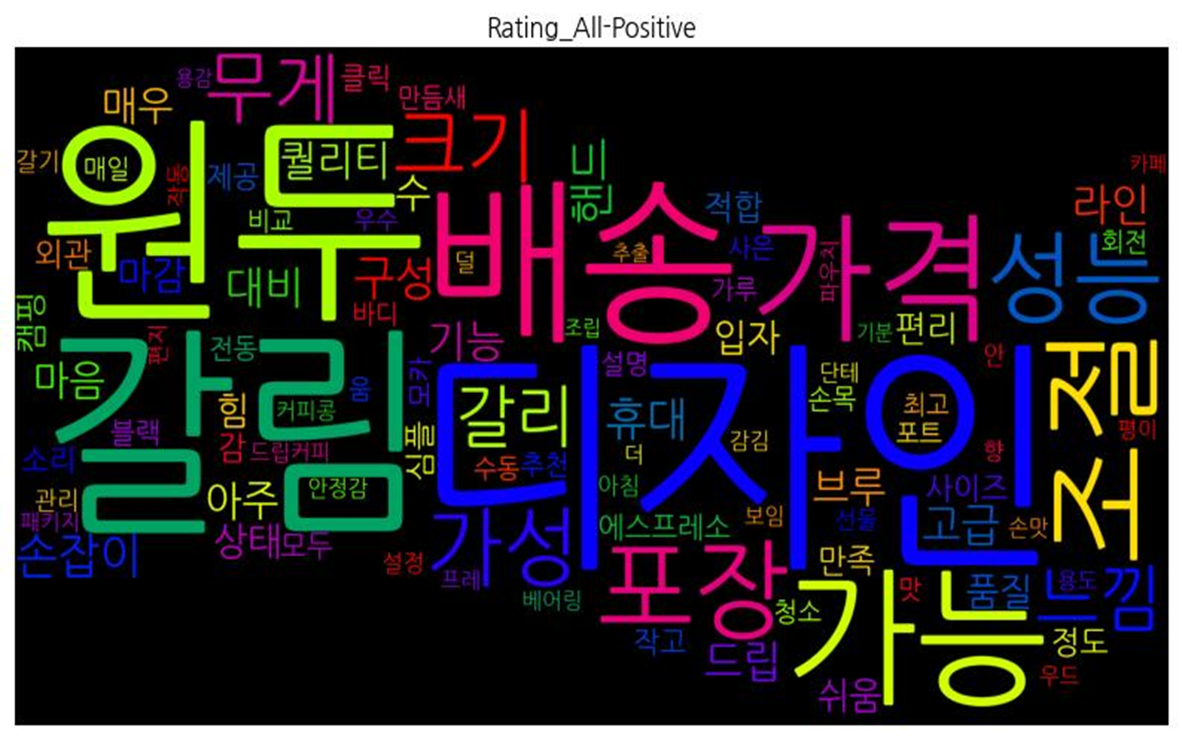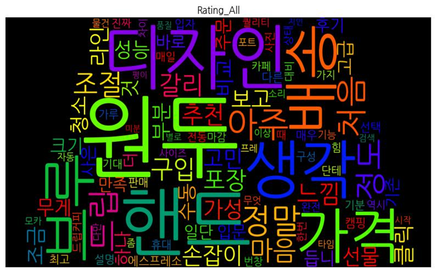 | 평점 전체 | ![]() [('원두', 584), ('핸드', 384), ('디자인', 337), ('생각', 267), ('가격', 234), ('배송', 225), ('브루', 223), ('아주', 205), ('드립', 194), ('정말', 191), ('정도', 186), ('처음', 183), ('조절', 178), ('마음', 154), ('갈리', 144), ('구입', 142), ('느낌', 137), ('포장', 132), ('추천', 130), ('손잡이', 121), ('보고', 119), ('가성', 116), ('고민', 116), ('클릭', 114), ('라인', 111), ('선물', 102), ('조금', 100), ('청소', 99), ('부분', 97), ('성능', 95), ('비교', 95), ('수동', 92), ('것', 89), ('무게', 87), ('크기', 87), ('하나', 86), ('고급', 86), ('듭니', 86), ('주문', 85), ('바로', 83), ('사은', 82), ('더', 81), ('후기', 80), ('일단', 78), ('만족', 77), ('입문', 76), ('기존', 73), ('에스프레소', 73), ('다른', 73), ('매우', 69), ('캠핑', 68), ('선택', 67), ('입자', 65), ('기분', 63), ('설명', 63), ('휴대', 63), ('최고', 62), ('진짜', 60), ('구성', 59), ('대비', 58), ('단테', 58), ('한번', 57), ('사진', 56), ('전동', 56), ('힘', 55), ('기대', 54), ('판매', 54), ('때', 54), ('매일', 53), ('가루', 53), ('상태', 51), ('카페', 51), ('드립커피', 51), ('가지', 49), ('완전', 49), ('번창', 48), ('마감', 47), ('역시', 47), ('차이', 46), ('기능', 46), ('퀄리티', 45), ('사이즈', 45), ('포트', 44), ('무엇', 44), ('물건', 43), ('소리', 43), ('자동', 43), ('좀', 43), ('모카', 42), ('프레', 42), ('이상', 42), ('다만', 42), ('타임', 40), ('시작', 39), ('별로', 38), ('검색', 38), ('품질', 37), ('지인', 36), ('미분', 36), ('평이', 36)] |