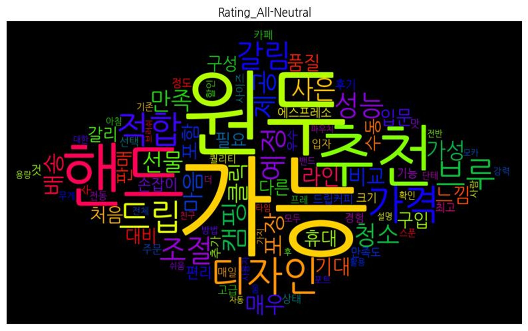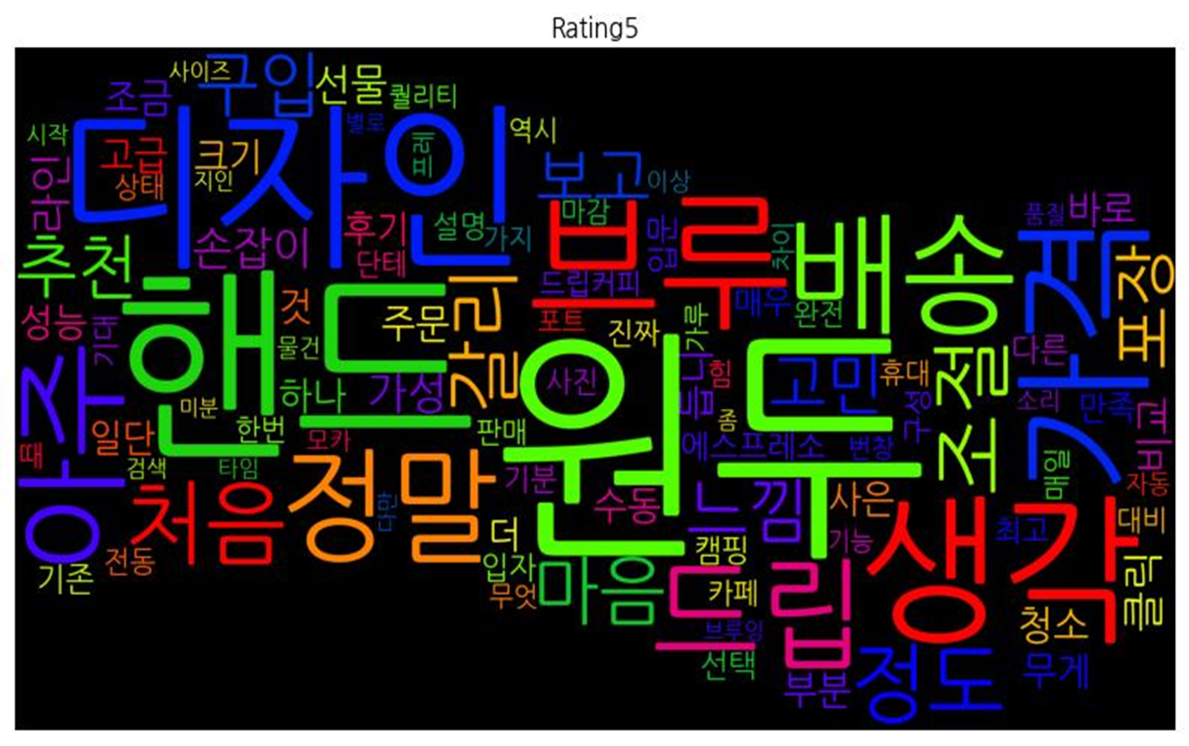 | 평점 5점 | ![]() [('원두', 547), ('핸드', 372), ('디자인', 308), ('생각', 245), ('가격', 221), ('브루', 212), ('배송', 211), ('정말', 189), ('아주', 189), ('드립', 185), ('처음', 170), ('정도', 169), ('조절', 159), ('갈리', 139), ('마음', 139), ('구입', 134), ('느낌', 130), ('추천', 127), ('포장', 121), ('고민', 113), ('보고', 113), ('손잡이', 112), ('가성', 111), ('라인', 105), ('클릭', 104), ('선물', 95), ('비교', 93), ('청소', 91), ('부분', 84), ('주문', 84), ('성능', 83), ('고급', 83), ('조금', 83), ('하나', 82), ('것', 82), ('수동', 81), ('무게', 80), ('크기', 79), ('듭니', 78), ('바로', 78), ('후기', 74), ('더', 74), ('일단', 73), ('사은', 72), ('에스프레소', 71), ('입문', 70), ('기존', 69), ('만족', 69), ('매우', 68), ('다른', 67), ('선택', 65), ('캠핑', 63), ('입자', 62), ('최고', 60), ('기분', 60), ('설명', 60), ('진짜', 57), ('구성', 56), ('사진', 54), ('전동', 54), ('단테', 54), ('힘', 54), ('판매', 52), ('매일', 51), ('대비', 50), ('카페', 49), ('기대', 49), ('한번', 49), ('드립커피', 49), ('때', 49), ('완전', 48), ('휴대', 48), ('상태', 47), ('가지', 46), ('역시', 46), ('마감', 45), ('무엇', 44), ('포트', 43), ('가루', 43), ('차이', 43), ('퀄리티', 42), ('번창', 42), ('기능', 42), ('프레', 41), ('모카', 40), ('이상', 40), ('소리', 40), ('자동', 40), ('물건', 39), ('시작', 38), ('타임', 37), ('검색', 37), ('품질', 37), ('사이즈', 37), ('별로', 35), ('지인', 35), ('브루잉', 35), ('좀', 35), ('미분', 34), ('다만', 34)] |
