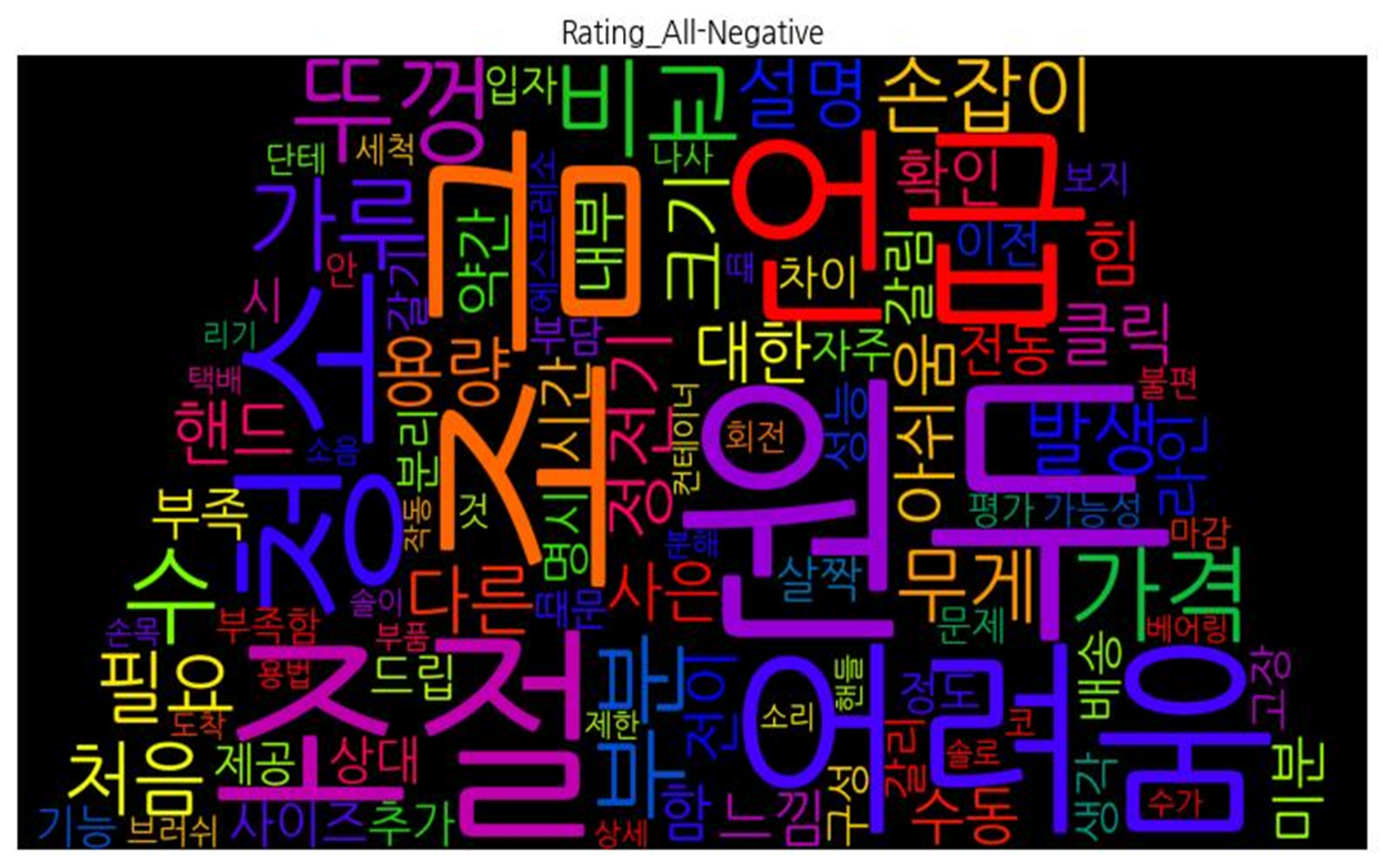 | 부정 속성 | ![]() [('원두', 66), ('조금', 50), ('조절', 39), ('언급', 35), ('어려움', 33), ('청소', 29), ('뚜껑', 28), ('비교', 23), ('수', 23), ('가격', 22), ('가루', 21), ('부분', 21), ('손잡이', 20), ('처음', 19), ('무게', 19), ('필요', 18), ('발생', 18), ('용량', 17), ('설명', 17), ('크기', 17), ('정전기', 17), ('다른', 16), ('아쉬움', 14), ('핸드', 14), ('힘', 14), ('대한', 13), ('클릭', 13), ('사은', 12), ('느낌', 11), ('확인', 11), ('수동', 11), ('전이', 11), ('함', 11), ('약간', 10), ('라인', 10), ('시간', 10), ('미분', 10), ('갈림', 9), ('전동', 9), ('부족', 9), ('내부', 9), ('사이즈', 9), ('명시', 9), ('상대', 9), ('살짝', 8), ('드립', 8), ('이전', 8), ('추가', 8), ('배송', 8), ('생각', 8), ('성능', 8), ('시', 8), ('제공', 7), ('차이', 7), ('정도', 7), ('고장', 7), ('기능', 7), ('분리', 7), ('갈기', 7), ('구성', 7), ('갈리', 7), ('자주', 7), ('입자', 6), ('때문', 6), ('부담', 6), ('부족함', 6), ('문제', 6), ('가능성', 6), ('보지', 6), ('평가', 6), ('안', 6), ('것', 6), ('마감', 5), ('에스프레소', 5), ('불편', 5), ('회전', 5), ('단테', 5), ('세척', 5), ('브러쉬', 5), ('나사', 5), ('코', 5), ('때', 5), ('리기', 4), ('분해', 4), ('소음', 4), ('솔이', 4), ('용법', 4), ('부품', 4), ('손목', 4), ('베어링', 4), ('소리', 4), ('수가', 4), ('컨테이너', 4), ('상세', 4), ('제한', 4), ('택배', 4), ('도착', 4), ('솔로', 4), ('핸들', 4), ('작동', 4)] |