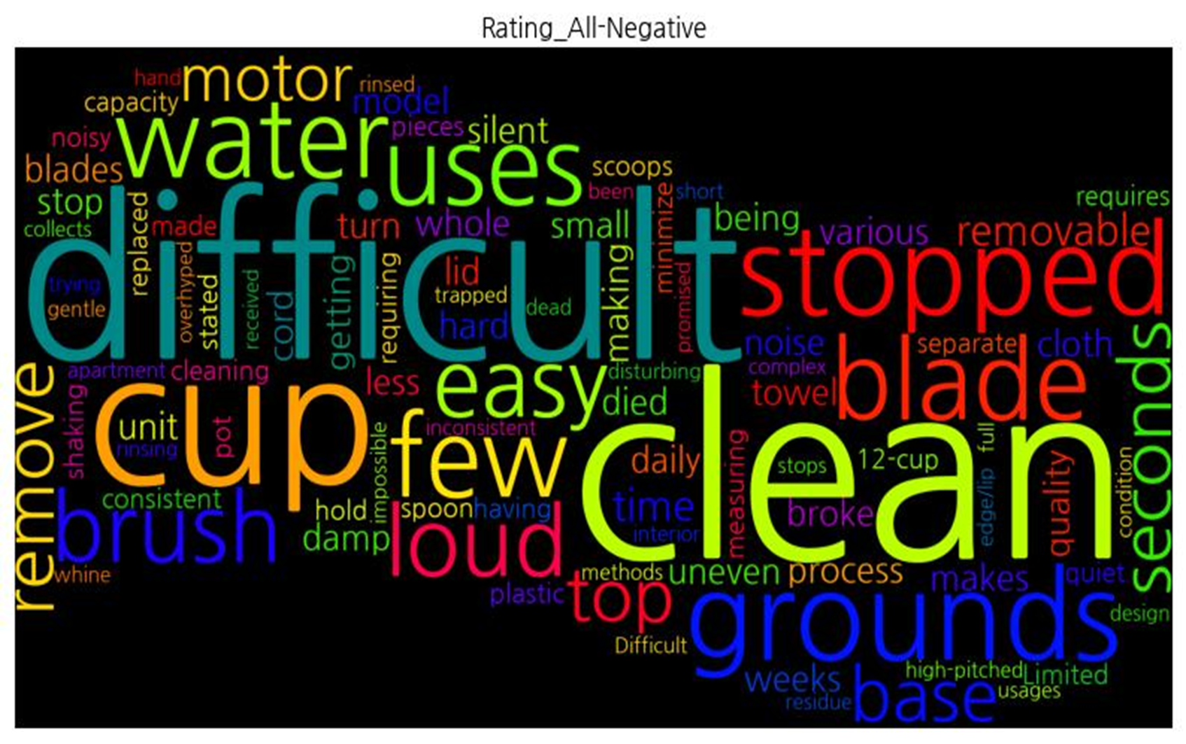 | 부정 속성 | ![]() [('clean', 10), ('difficult', 9), ('cup', 6), ('stopped', 5), ('grounds', 5), ('few', 4), ('water', 4), ('blade', 4), ('uses', 4), ('brush', 3), ('loud', 3), ('easy', 3), ('base', 3), ('top', 3), ('seconds', 3), ('remove', 3), ('motor', 3), ('removable', 3), ('time', 3), ('model', 2), ('small', 2), ('damp', 2), ('cloth', 2), ('hard', 2), ('towel', 2), ('noise', 2), ('makes', 2), ('cord', 2), ('lid', 2), ('various', 2), ('less', 2), ('weeks', 2), ('process', 2), ('blades', 2), ('getting', 2), ('making', 2), ('turn', 2), ('quality', 2), ('silent', 2), ('died', 2), ('unit', 2), ('stop', 2), ('being', 2), ('broke', 2), ('daily', 2), ('uneven', 2), ('whole', 2), ('noisy', 1), ('cleaning', 1), ('Limited', 1), ('capacity', 1), ('12-cup', 1), ('pot', 1), ('measuring', 1), ('spoon', 1), ('replaced', 1), ('requires', 1), ('shaking', 1), ('consistent', 1), ('hold', 1), ('scoops', 1), ('plastic', 1), ('made', 1), ('pieces', 1), ('separate', 1), ('having', 1), ('quiet', 1), ('stated', 1), ('requiring', 1), ('minimize', 1), ('high-pitched', 1), ('whine', 1), ('disturbing', 1), ('apartment', 1), ('complex', 1), ('short', 1), ('inconsistent', 1), ('interior', 1), ('design', 1), ('rinsing', 1), ('trapped', 1), ('trying', 1), ('methods', 1), ('dead', 1), ('usages', 1), ('Difficult', 1), ('edge/lip', 1), ('collects', 1), ('rinsed', 1), ('stops', 1), ('been', 1), ('overhyped', 1), ('received', 1), ('promised', 1), ('condition', 1), ('residue', 1), ('impossible', 1), ('hand', 1), ('full', 1), ('gentle', 1)] |