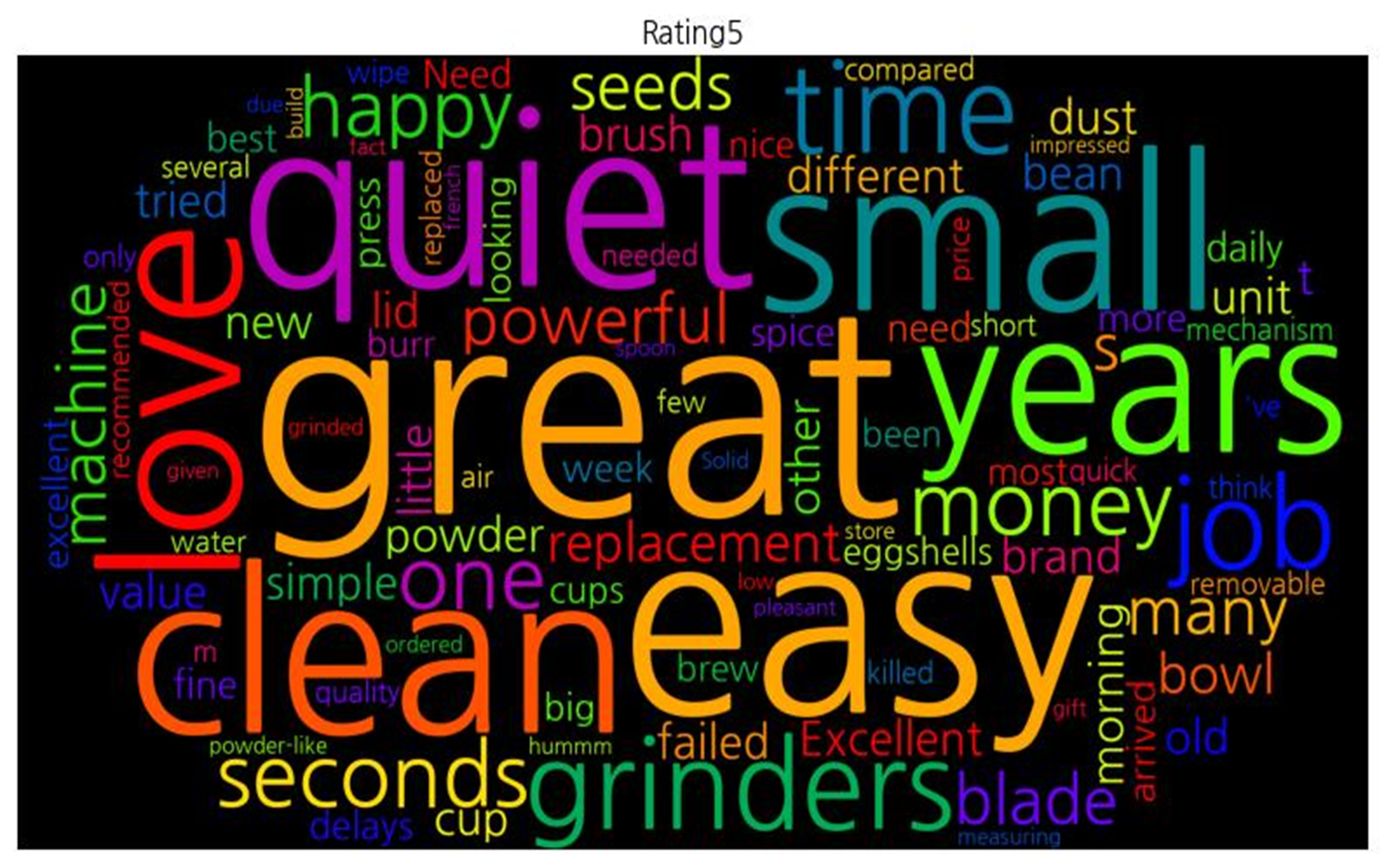 | 평점 5점 | ![]() [('great', 14), ('easy', 11), ('quiet', 9), ('clean', 9), ('small', 8), ('years', 7), ('love', 7), ('grinders', 6), ('time', 6), ('job', 6), ('seconds', 5), ('one', 5), ('money', 5), ('happy', 4), ('powerful', 4), ('seeds', 4), ('s', 4), ('many', 4), ('blade', 4), ('machine', 4), ('replacement', 4), ('bowl', 4), ('value', 3), ('unit', 3), ('brush', 3), ('old', 3), ('little', 3), ('dust', 3), ('powder', 3), ('Excellent', 3), ('morning', 3), ('other', 3), ('t', 3), ('cup', 3), ('lid', 3), ('bean', 3), ('failed', 3), ('tried', 3), ('new', 3), ('simple', 3), ('different', 3), ('brand', 3), ('need', 2), ('press', 2), ('Need', 2), ('spice', 2), ('week', 2), ('arrived', 2), ('delays', 2), ('more', 2), ('fine', 2), ('best', 2), ('daily', 2), ('eggshells', 2), ('most', 2), ('cups', 2), ('been', 2), ('burr', 2), ('brew', 2), ('excellent', 2), ('nice', 2), ('looking', 2), ('big', 2), ('compared', 2), ('needed', 2), ('quality', 2), ('m', 2), ('quick', 2), ('air', 2), ("'ve", 2), ('few', 2), ('wipe', 2), ('short', 2), ('think', 2), ('several', 2), ('mechanism', 2), ('price', 2), ('removable', 2), ('only', 2), ('killed', 2), ('recommended', 2), ('replaced', 2), ('water', 2), ('french', 1), ('Solid', 1), ('build', 1), ('given', 1), ('gift', 1), ('fact', 1), ('store', 1), ('due', 1), ('ordered', 1), ('grinded', 1), ('powder-like', 1), ('low', 1), ('pleasant', 1), ('hummm', 1), ('impressed', 1), ('measuring', 1), ('spoon', 1)] |