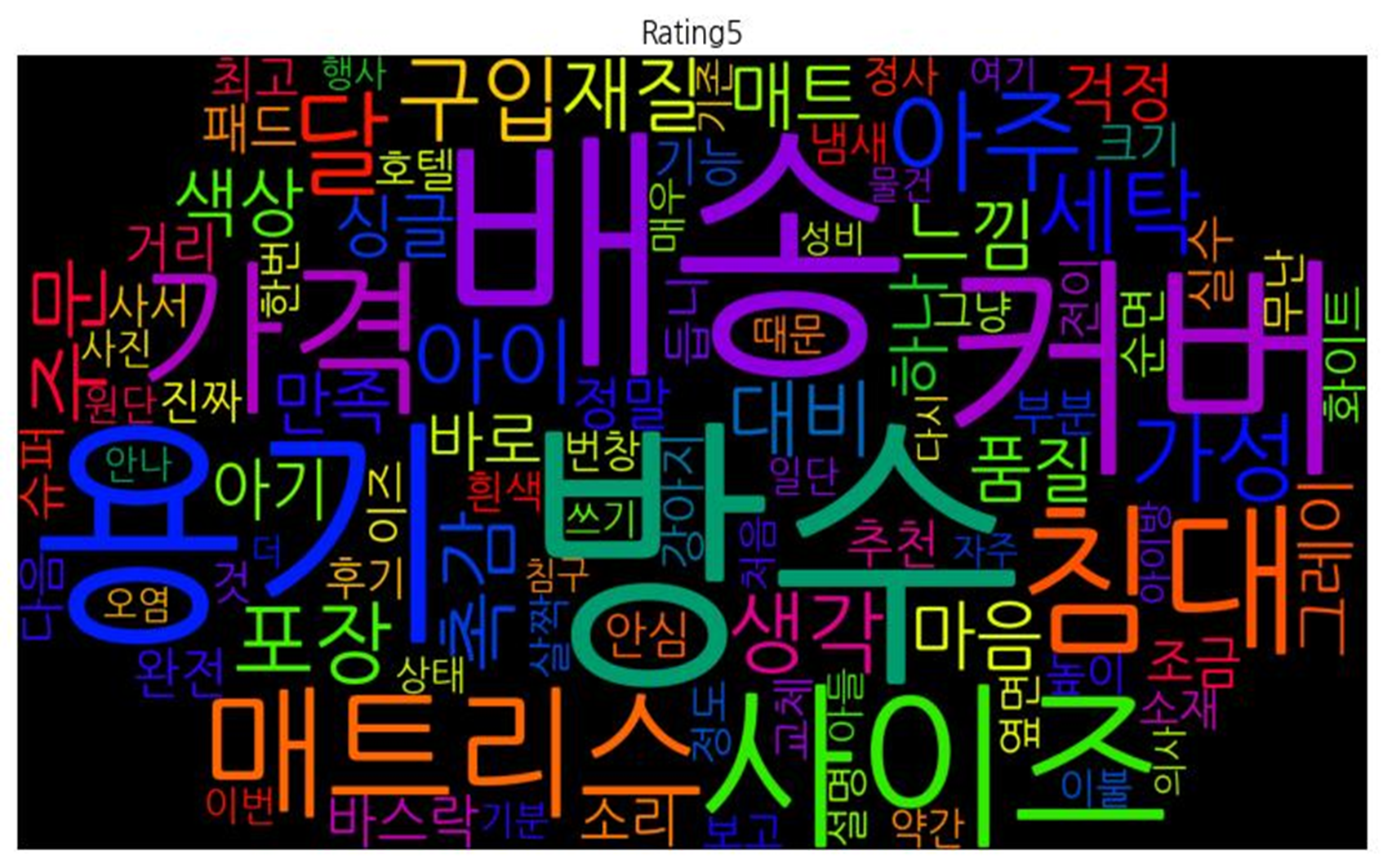 | 평점 전체 | ![]() [('방수', 3608), ('배송', 2932), ('용기', 2404), ('커버', 2279), ('사이즈', 2229), ('가격', 1952), ('침대', 1783), ('매트리스', 1705), ('달', 1033), ('아주', 862), ('가성', 718), ('생각', 712), ('세탁', 691), ('구입', 660), ('아이', 656), ('주문', 637), ('포장', 603), ('촉감', 578), ('대비', 576), ('재질', 518), ('느낌', 496), ('색상', 449), ('매트', 435), ('마음', 414), ('싱글', 365), ('품질', 364), ('하나', 358), ('조금', 339), ('아기', 317), ('만족', 315), ('그레이', 314), ('바스락', 312), ('바로', 310), ('소리', 309), ('걱정', 286), ('패드', 263), ('부분', 261), ('정말', 249), ('거리', 243), ('슈퍼', 242), ('순면', 233), ('기능', 232), ('추천', 224), ('그냥', 220), ('실수', 219), ('완전', 210), ('다음', 210), ('화이트', 207), ('옆면', 204), ('무난', 202), ('살짝', 195), ('듭니', 189), ('최고', 188), ('약간', 188), ('크기', 187), ('강아지', 184), ('냄새', 181), ('보고', 180), ('안심', 180), ('소재', 179), ('전이', 177), ('사서', 175), ('후기', 172), ('정도', 172), ('진짜', 164), ('이즈', 164), ('높이', 163), ('것', 162), ('호텔', 160), ('교체', 154), ('흰색', 148), ('정사', 148), ('설명', 146), ('원단', 146), ('일단', 142), ('한번', 142), ('쓰기', 140), ('때문', 137), ('이불', 137), ('사진', 132), ('처음', 126), ('번창', 125), ('아들', 125), ('이번', 124), ('더', 122), ('상태', 121), ('다시', 121), ('성비', 121), ('기존', 119), ('자주', 118), ('매우', 116), ('행사', 115), ('의사', 114), ('화면', 113), ('오염', 112), ('고양이', 112), ('안나', 111), ('확인', 111), ('다른', 110), ('기분', 107)] |